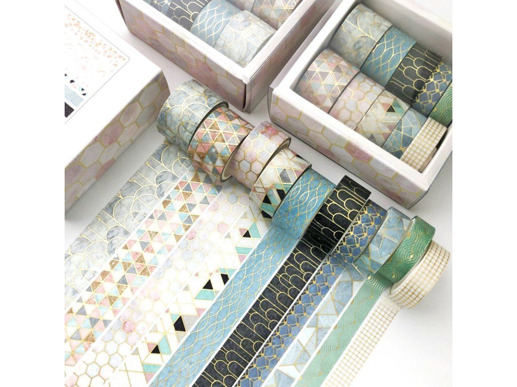 Papírové dekorativní washi pásky s elegantním zlatým potiskem, který oživí stránky diáře či zápisníku.